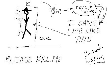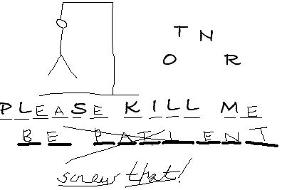 Fraser looks at him sympathetically and draws another nine spaces underneath the hanged man. But maybe Ray's got a little touch of Fraser's telepathy tonight, because he knows just what Fraser wants to say. He fills in the blanks, then crosses the words out.
